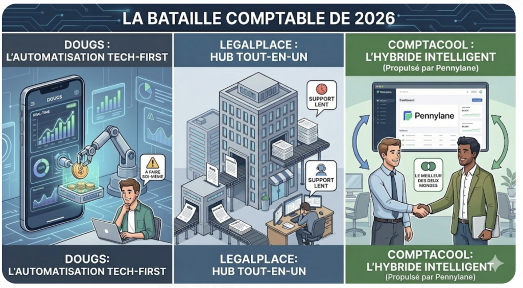 Après avoir analysé le duel final entre Dougs et Clémentine en 2026 et comparé Dougs à Comptastar, il est temps d’opposer deux visions radicalement différentes de l’accompagnement entrepreneurial : Dougs et LegalPlace.